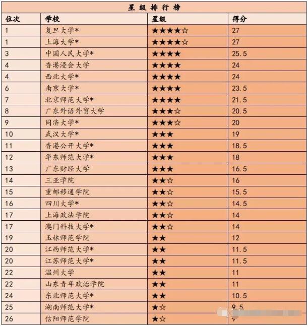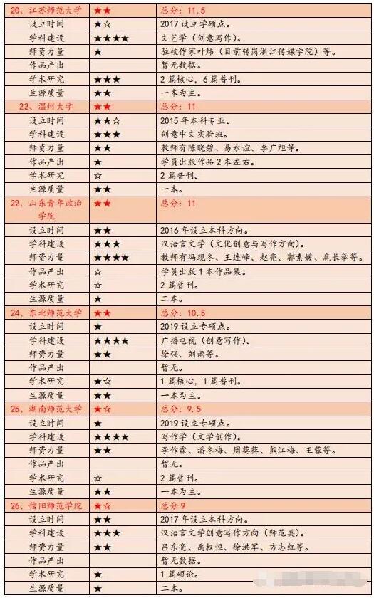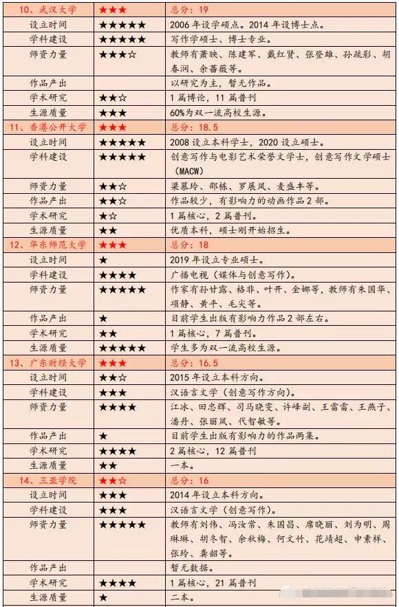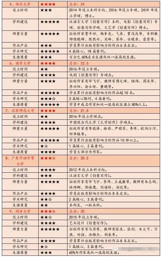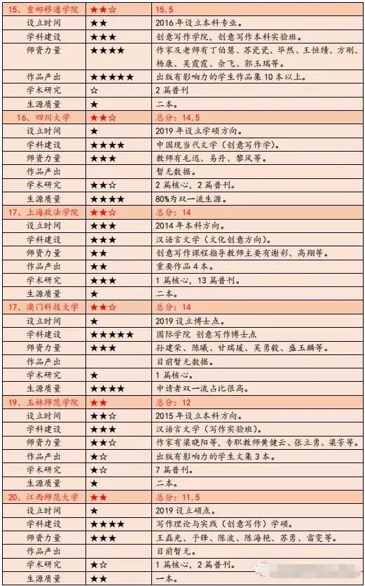 注:本排行榜没有收录暂停招生的学校,如北京大学、浙江大学等,同时,本排行榜也没有收录开设英文创意写作专业的学校,比如中山大学。此外,台湾地区数据暂时缺乏。需要说明的是,很多学校只开设了本科课程,如东南大学、浙江传媒学院、上海视觉艺术学院、杭州师范大学、西安财经大学、西安外事学院、西安翻译学院等,却并没有开设创意写作本科专业或方向,本表没有收录。表格当中学校名称后加 * 代表该校拥有有创意写作硕士点或博士点。