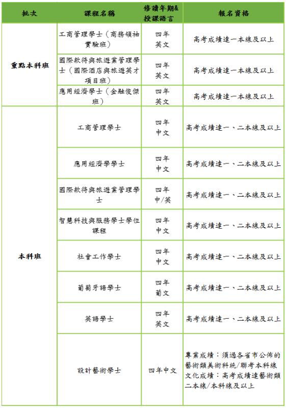 普通本科班:高考成绩达二本/段线(二、三合併的本科线)及以上,择优录取。