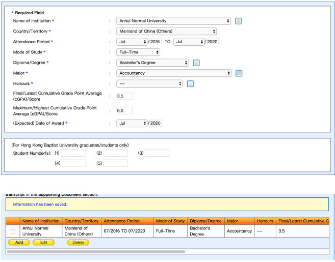 点击save保存,如果还有其它学位,点击save后,再点击add继续添加。