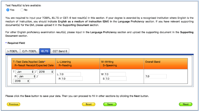 7. 填写英语考试成绩English Language Proficiency