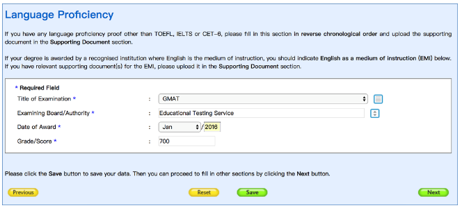 8. 填写语言成绩Language Proficiency
