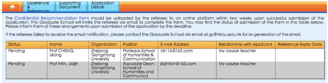 点击页面上方的Experience&References可以看到推荐人通过网推提交推荐信的状态。(Pending为网推邮件还未发送,发送之后会变成Work in progress)