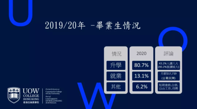 根据香港伍伦贡学院官方调查,去年80.7%的学生成功升学,其中,43.2%升入香港八大校资助学位课程,41.7%升读自资学位课程,7.2%于本地就修读海外大学学位课程,5%则到海外升学。