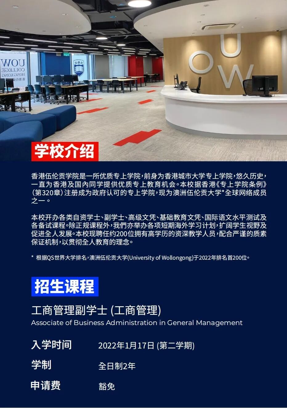 香港伍伦贡学院(原香港城市大学专上学院)开放2022年春季入学的副学士课程申请了!