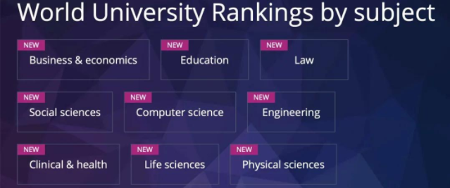 最近,英国《泰晤士高等教育》开始更新世界大学学科排名,排名一共分商业与经济、教育、法律、社会科学、计算机科学、工程学、临床医学、生命科学、物理科学、心理学和人文艺术领域。目前仅有人文艺术没有更新。这次的排名细化到学科,对世界各大学的法律、商业及经济学、社会科学及教育学科等进行了排名。