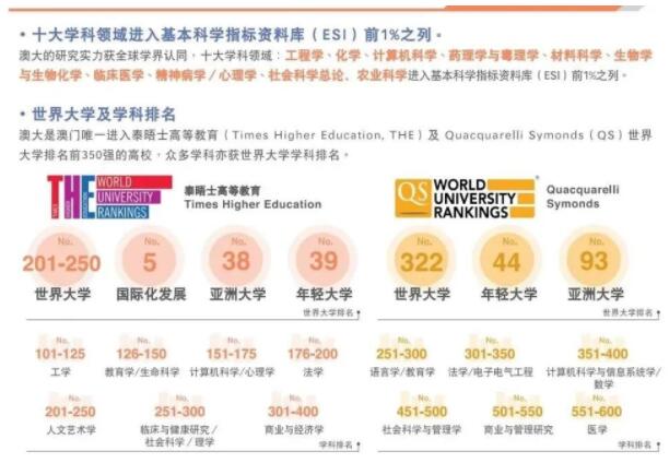澳大是澳门唯一进入泰晤士高等教育(Times Higher Education, THE)及Quacquarelli Symonds(QS) 世界大学排名前350强的高校,泰晤士高等教育世界大学排名201-250 、亚洲大学排名38、国际化发展第五、全球年轻大学排名39。在 “Quacquarelli Symonds(QS)世界大学排名” 322位