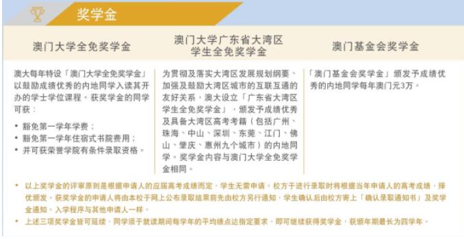 澳门大学设立了以下三大奖学金予高考成绩优异的内地新生入读学士学位课程: