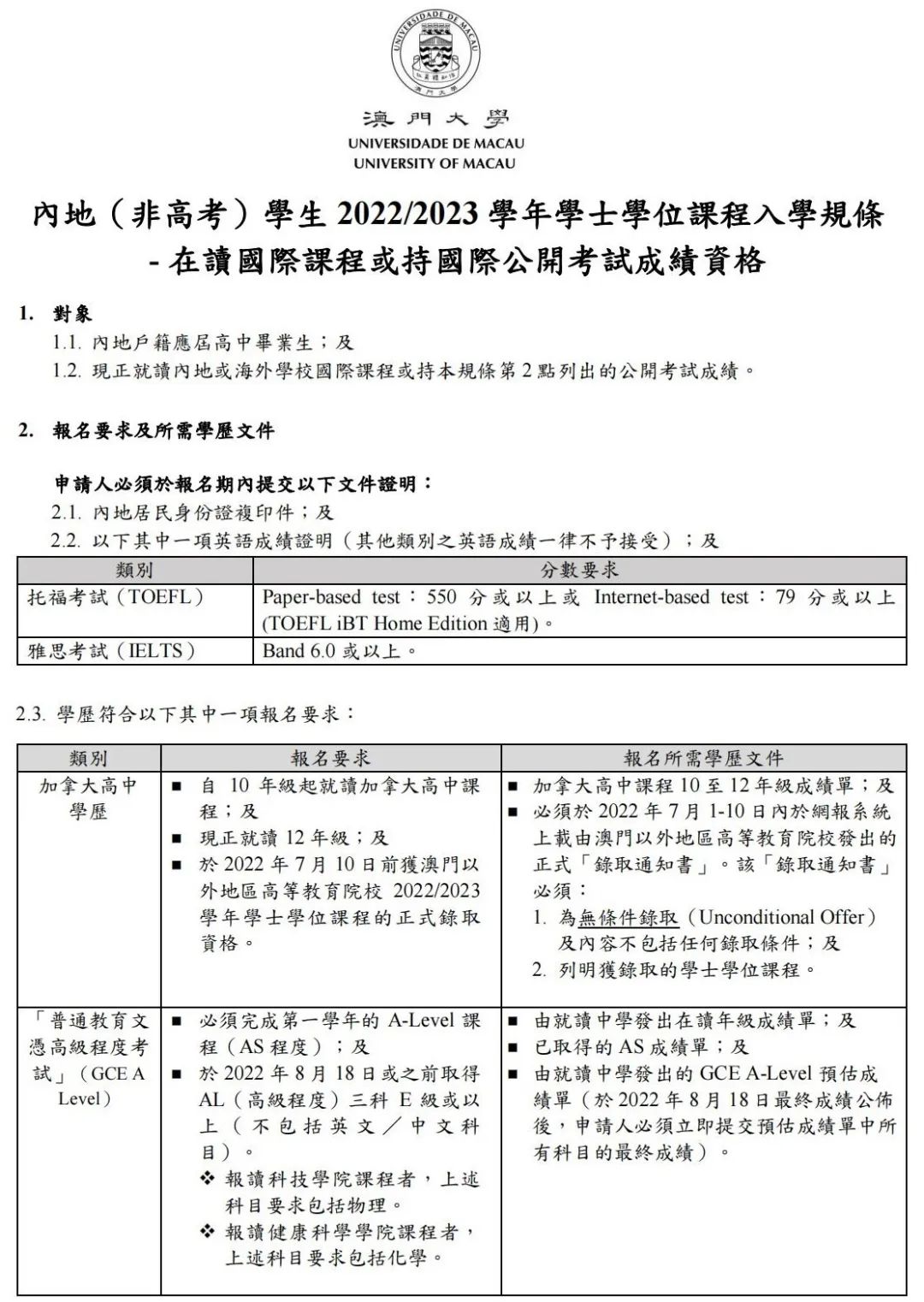 2. 现正就读内地或海外学校国际课程或持有符合要求的公开考试成绩。