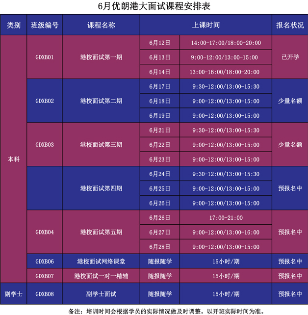 据杭州优朗国际英语的官方消息显示,2014年6月优朗港大本科生面试培训的课程安排已经公布,而且第一期报名已满,第二期名额所剩也不多,希望有意向的同学合理安排时间报名参加培训。