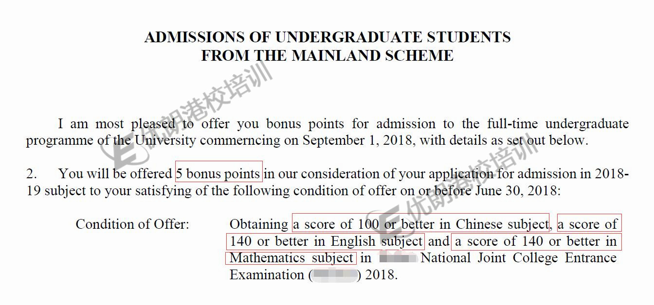 Joffy:香港大学面试通过则意味着获得了有条件录取的优惠条件,往年表现在加分上,但最近几年有所改革,在加分优惠的基础上,对学生的语数外单科成绩有一定要求。在此,可以给大家看下之前获得有条件加分的学员通知书上情况: