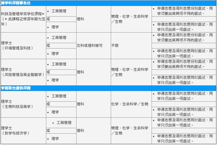申请人可选报下列十九个申请志愿选项其中之一项。当中部分申请志愿选项备有调剂志愿,本校将邀请同学出席申请志愿及调剂志愿的面试。