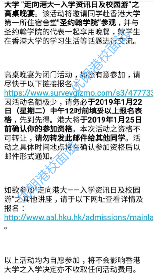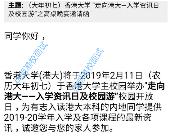 最近很多同学收到香港大学的一封邮件,主题是“走向港大—入学资讯日及校园游”之高桌晚宴邀请函。据邮件内容可见,香港大学将于2019年2月11日(农历大年初七)在港大校园举办校园开放日,为有志入读香港大学本科的内地学生提供2019-2020学年入学及各项课程的最新资讯。