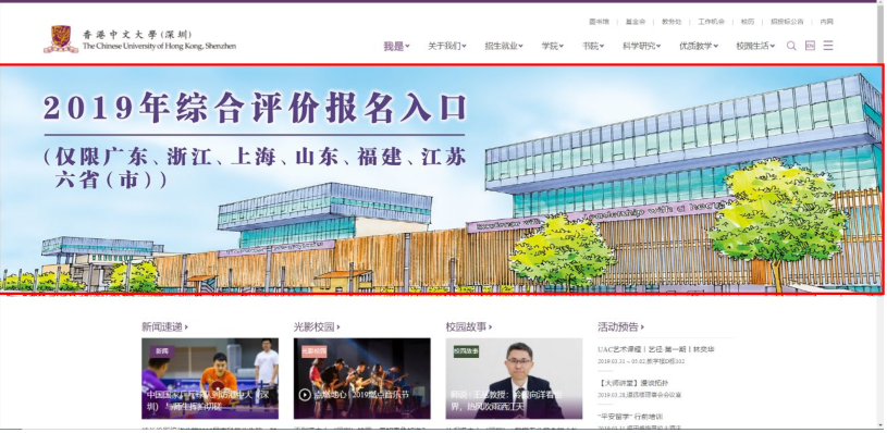 1.进入香港中文大学(深圳)官网“http://www.cuhk.edu.cn/”点击“2019年综合评价报名入口”。