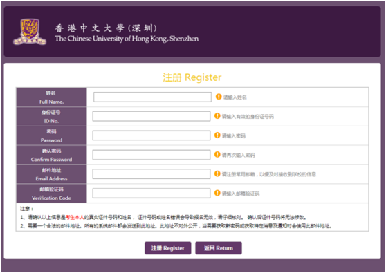 1.进入香港中文大学(深圳)报名系统登录界面后点击“注册”,如果忘记密码可点击“找回密码”