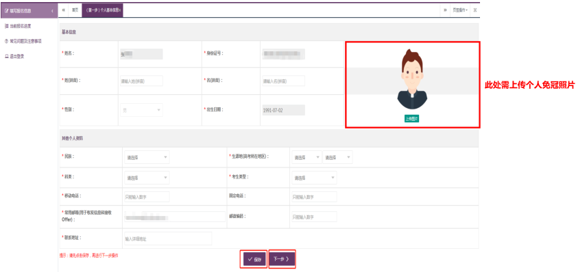 1.个人基本信息填写:标*号的均是必填项,所有信息请如实填写,此处需上传个人免冠照片(大小2M以内,支持JPG及JPEG格式);所有信息填写完成后需要点击“保存”再进行“下一步”操作。