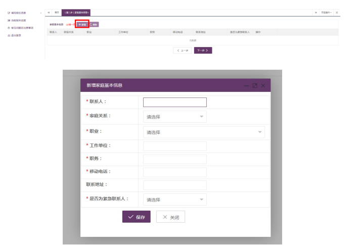 2.家庭基本信息填写:至少必填一项家庭基本信息,点击“新增”按钮进行编辑,所有*项目必填。