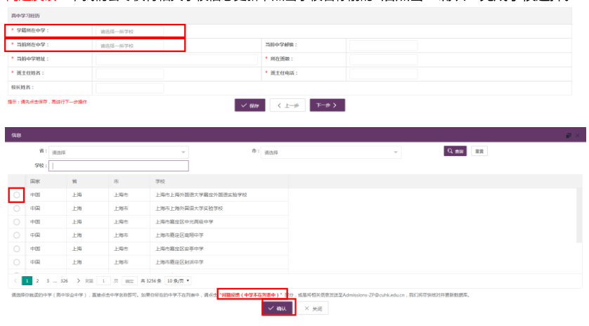 3.高中学习经历:所有标*项目必填;点击空格后会出现学校查询页面,如您的学校不在列表中,可点击“问题反馈”,我们会尽快将相关学校信息更新;点击学校名称前后的o后点击“确认”完成学校选择。