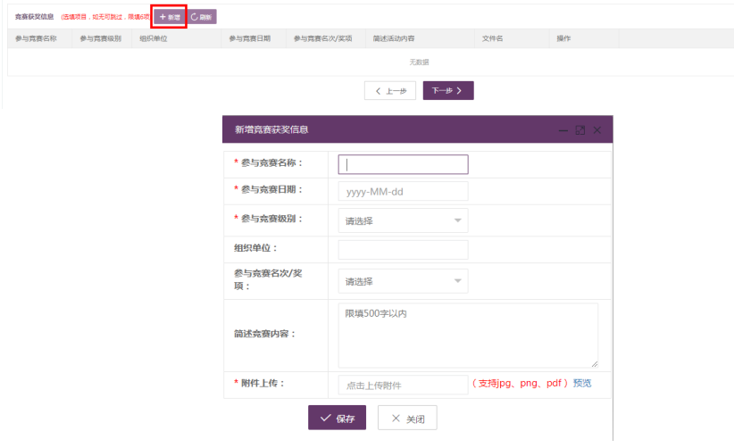 5. 竞赛获奖信息:选填项目,如无可跳过,限填6项;点击“新增”按钮进行编辑,所有标*项目必填。