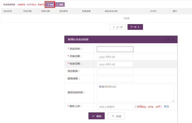 6. 社会活动信息:选填项目,如无可跳过,限填6项;点击“新增”按钮进行编辑,所有标*项目必填。