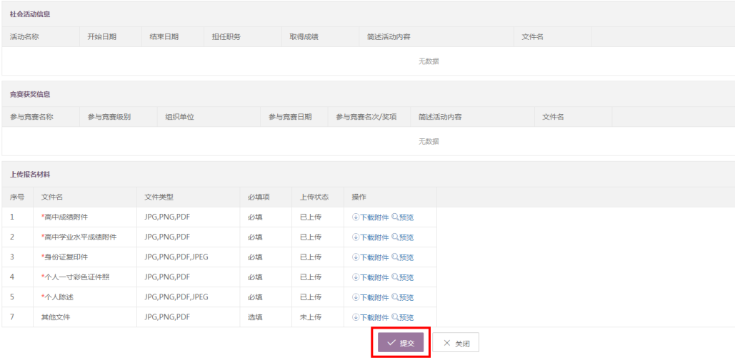 所有信息填写及附件上传后可进行完整报名信息预览,如确认无误后可点击“提交”按钮提交申请。