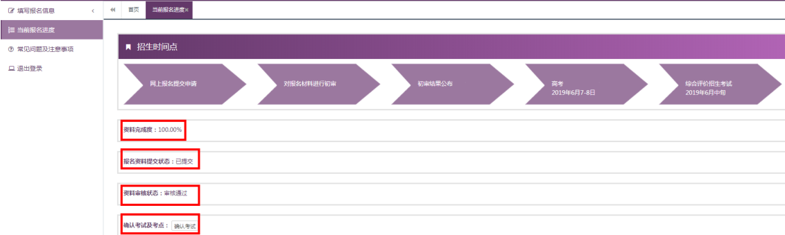 报名材料提交后,考生邮箱将会收到系统自动发送的确认提交的邮件;考生可随时登陆系统并进入“当前报名进度”对自己的报名状态进行查看;初审结果将于5月28日后在学校官网及报名系统上公布,考生邮箱也会同时收到邮件通知。具体报名状态为: