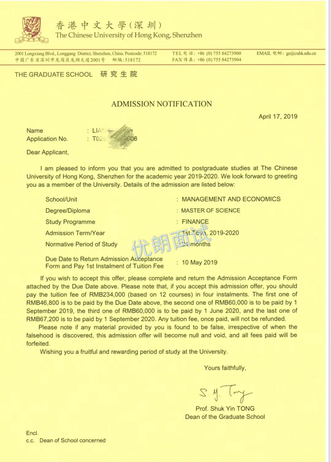 喜讯:恭喜梁ZS同学录取香港中文大学(深圳)金融硕士