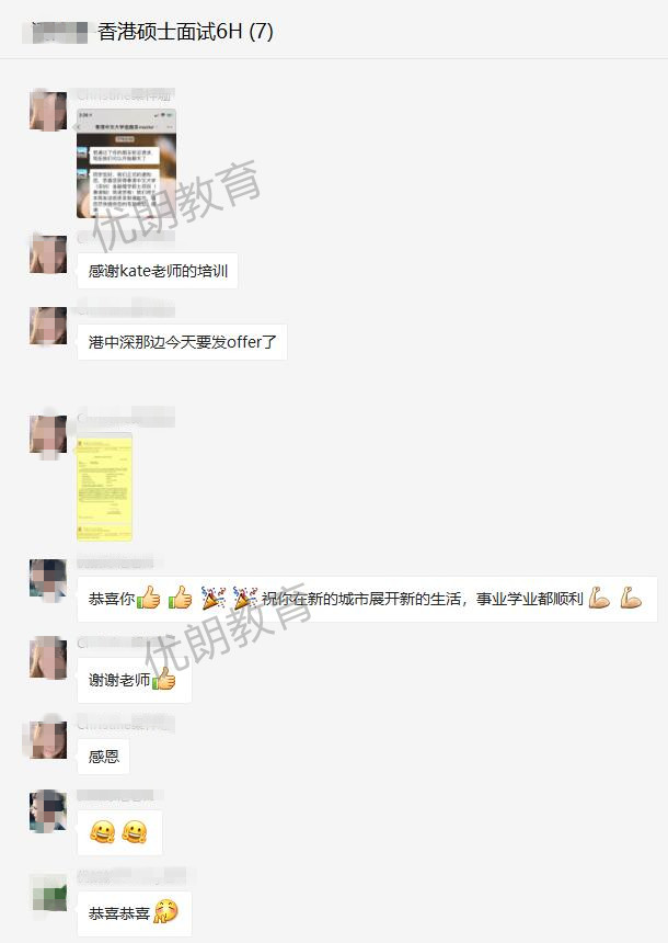 梁同学对优朗港校研究生面试教学工作颇为赞赏,以下是在群里分享喜讯、感谢老师的聊天截图