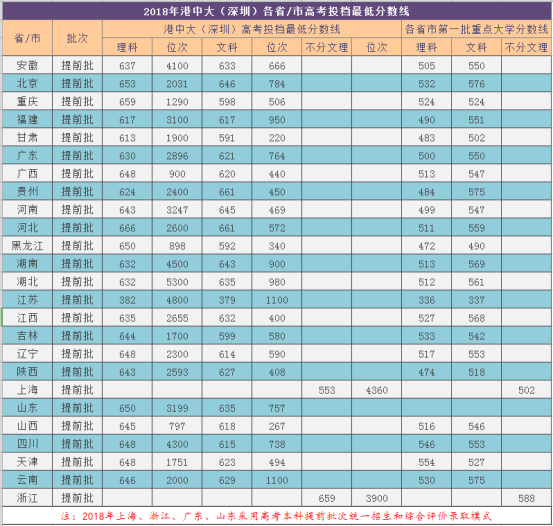 (2018年港中大(深圳)各省/市高考投档最低分数线)