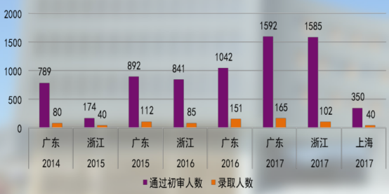 经过五年的办学实践,社会各界对港中大(深圳)教育理念的认可度不断增强,未来将有更多的省份加入“综合评价录取模式”的行列。从下列图表中可以看出,综合评价报考热度在逐年增加,例如2015年浙江省只有174人参加三位一体暨综合评价考试,最终录取40人,录取比例只有4:1,2017年浙江省有1585名考生参加考试,最终录取102人,录取比例增长到了15.5:1。