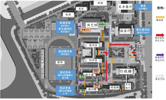 (学军中学(紫金港校区)场地分布及入场路线引导图)