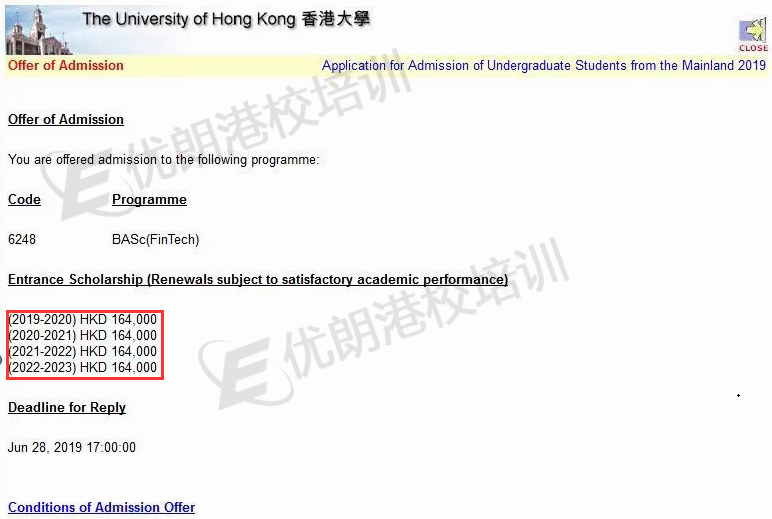 值得庆贺的是,2019年优朗学员斩获港大科大奖学金总额达266万。其中,3位学员拿到香港大学全额奖学金,每年16.4万港币,将涵盖学生在港大就读期间全部的学费及基本生活费。此外,还有2两位学员分别获得香港科技大学28万奖学金,1位学员获得香港科技大学14万奖学金。