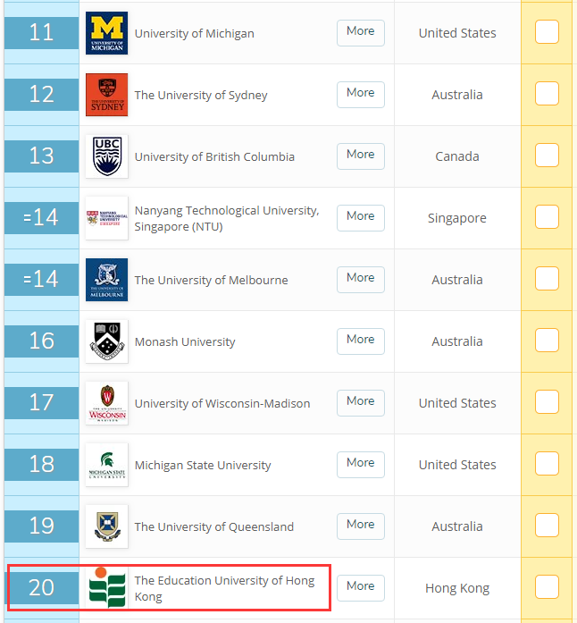 香港教育大学世界排名:在2019年的 QS师范类排名中,香港教育学院超越爱丁堡大学,约翰霍普金斯大学,香港中文大学,位于世界第20位。