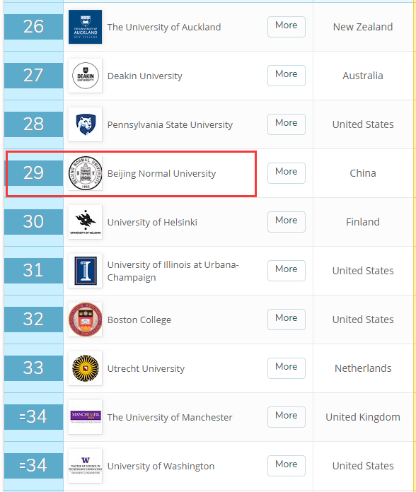 与同等学校北京师范大学对比:北京师范大学作为中国大陆排名第一的师范类院校,但是在2019年Q S排名为29位。