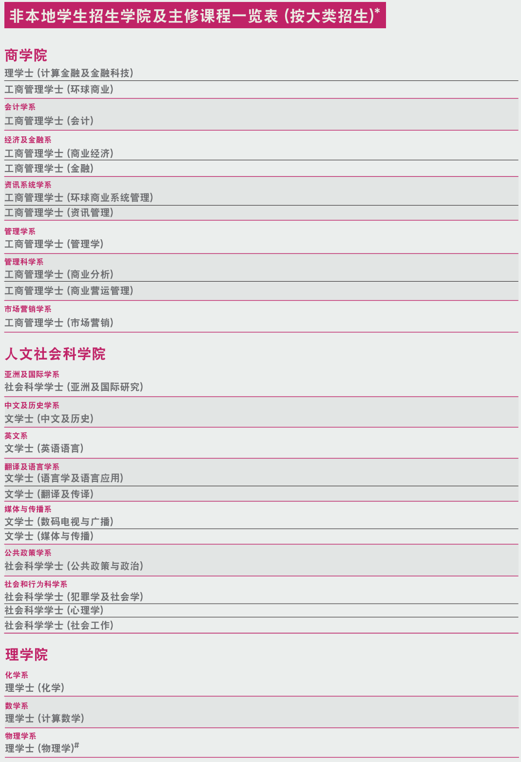 香港城市大学 (城大) 获教育部批准,按照內地重点高校招生的程序和办法透过提前批次录取內地优秀高考生,不影响考生报考内地重点大学。考生报名时间和办法应按照各省级招生考试机构公布的志愿填报办法报考。 全国31个省、直辖市及自治区的高考生应循全国普通高校统一招生计划报读城大,无须另行填写城大入学申请表。