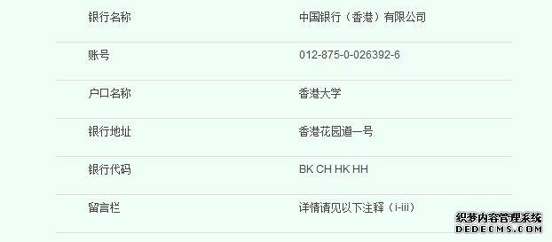申请者可使用MasterCard、VISA或银联等信用卡进行网上付款,亦可选择到银行以汇票、汇款或直接存款致港大户口的方式支付申请费用,随后将汇款证明正本寄交本处,来件须注明申请人姓名、申请编号及联系电话,以免延误申请。