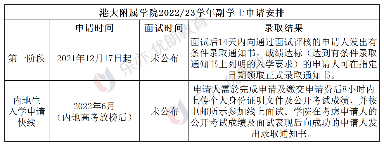 其中,2022/23学年,港大附属学院于2021年12月17日接受内地申请人报名,申请分为两个阶段,具体见下表;而保良何鸿燊社区书院已于2021年12月9日就已经接受内地申请人的报名。