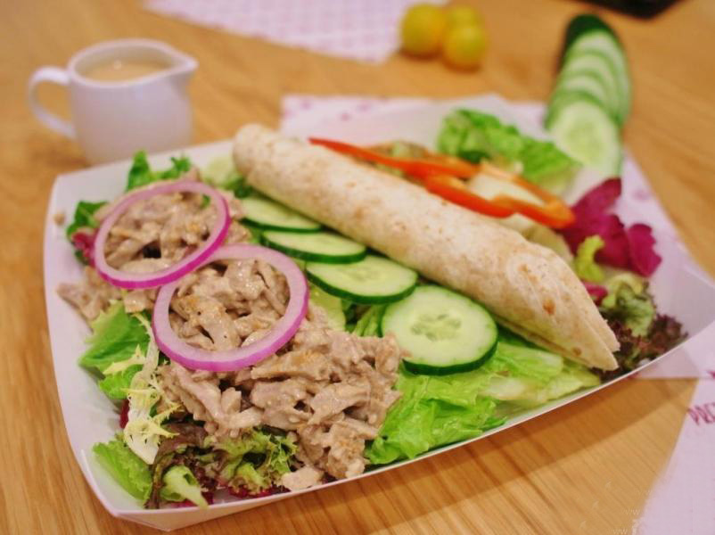以大量新鲜蔬菜,配搭以芝麻酱调味的鸭肉沙律,亮点是那一片口感烟韧的簿饼,把材料卷着来吃,感觉就是好。