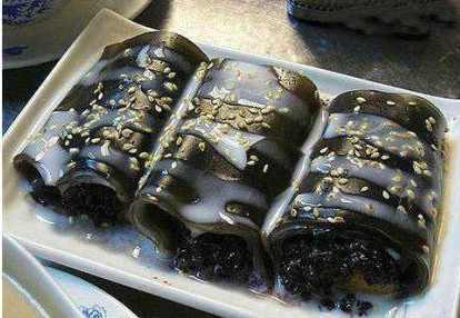 又名「菲林卷」,是七八十年代在各大茶樓紅極一時的壓軸甜品,近年已買少見少。現在有都是工場大量生產的貨色。芝麻卷使用黑芝麻、冰糖及马蹄粉做成粉浆,蒸好后再卷起而成。其卖相是黑色一卷卷,有如小型黑色布匹绸缎,亦因为像一卷曝光菲林,又名“菲林卷”。芝麻卷是满汉全席中第一宴席的其中一道菜式。通常做芝麻卷会卷七圈,每一圈也很平均,咬落去以有弹牙清凉为佳。除了原味黑色芝麻卷之外,还有橙色的加入橙汁味的芝麻卷。