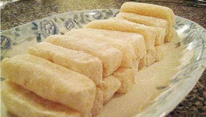 香蕉糕 小时家穷,吃不起矜贵的燕窝糕、云片糕,只好吃香蕉糕。记得廿年前旺角花园街水静鹅飞 时期奇趣已有得卖,一大盆香蕉糕摆在门前,足足二三百件,一个早上已卖光。廿年后奇趣 始终如一,香蕉糕依然大大盆不愁卖,老板兼师傅的张生亲力亲为,用熟糯米粉、糖水和香 蕉油,一搓即成,秘诀是用暖的糖水令糕身又软又糯,放一天半天仍可不硬身。香蕉糕的确 软熟香甜,淡淡香蕉油味不抢。